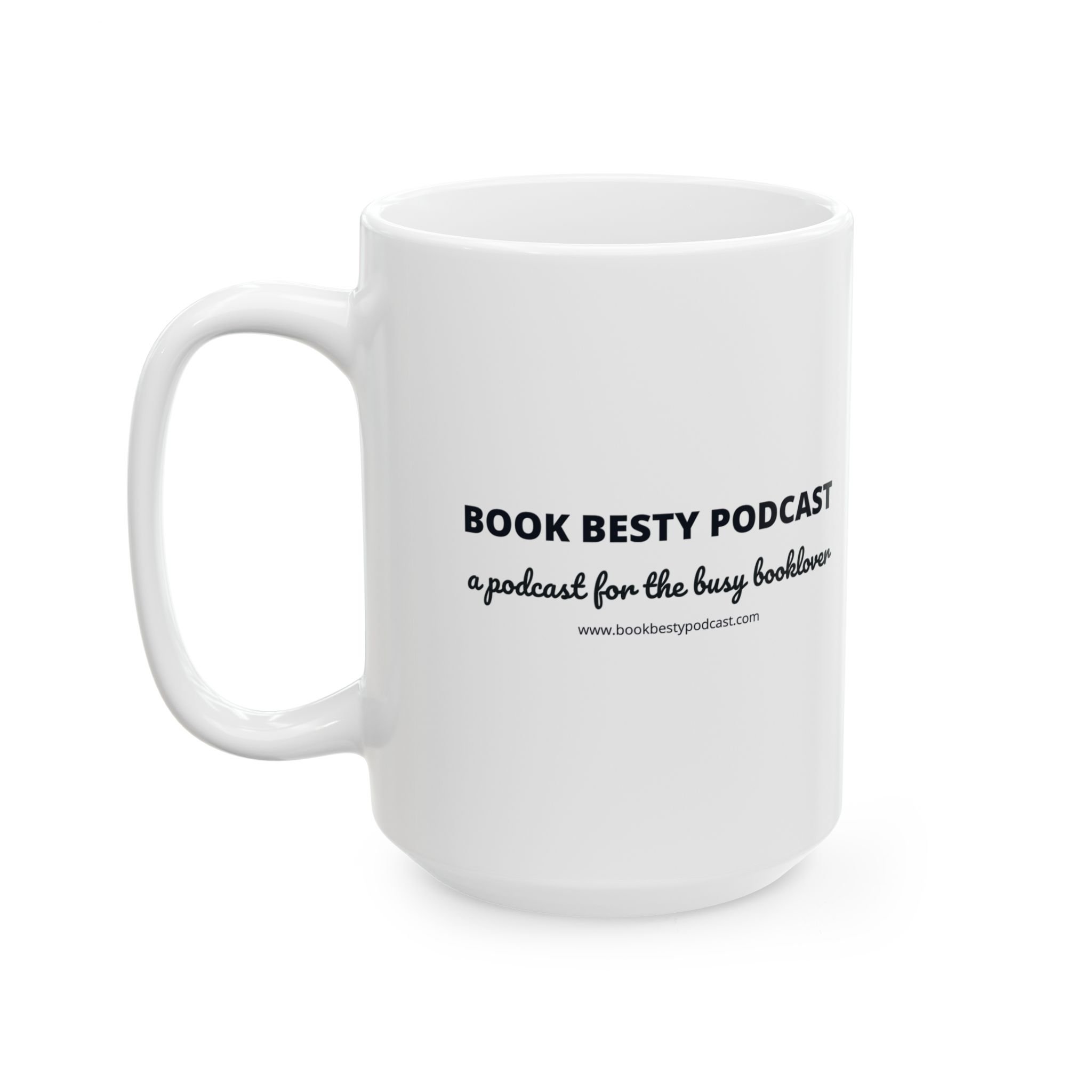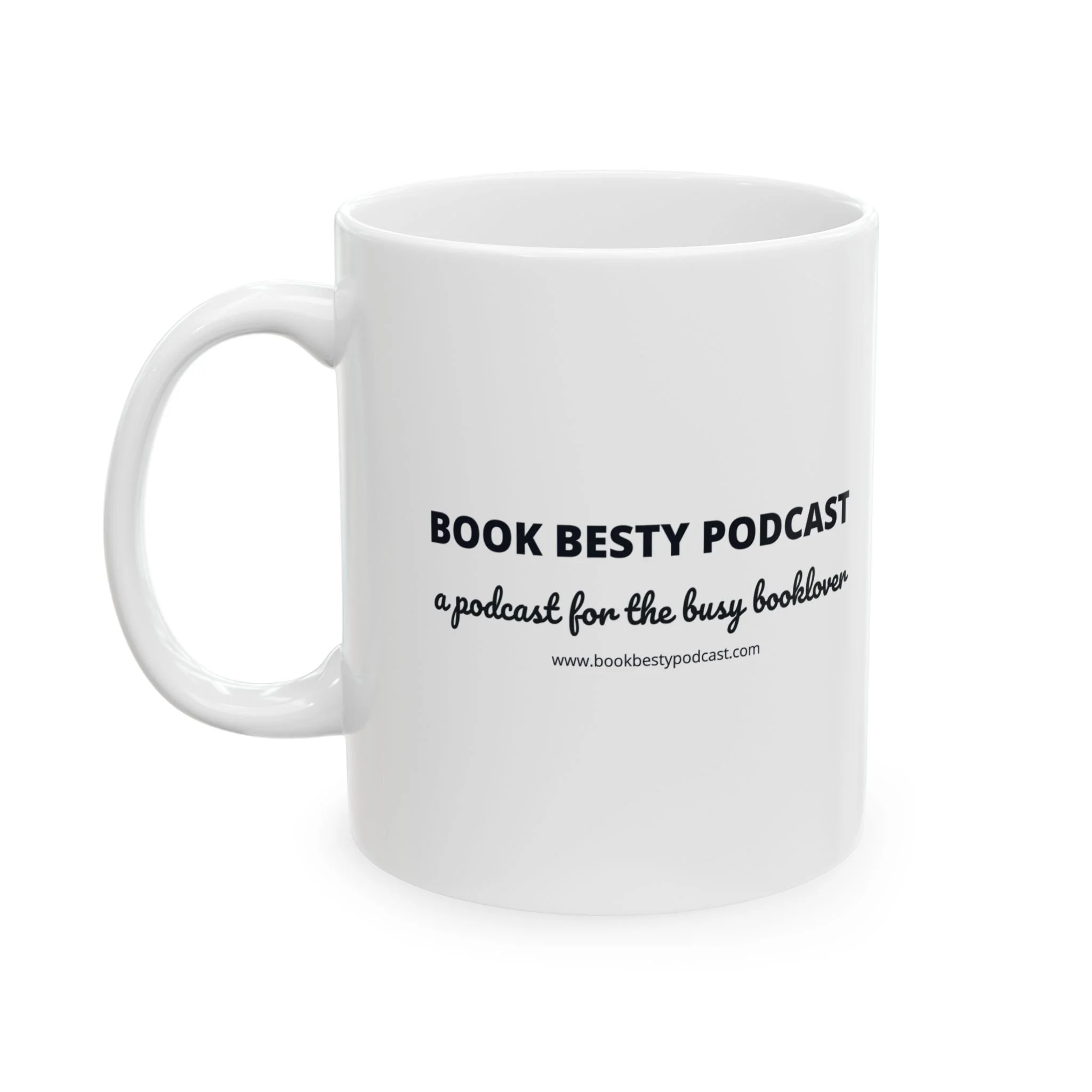 Sip slowly from this bright white Book Besty Podcast ceramic mug. The glossy surface makes the printed artwork pop while the C-handle sits comfortably in your hand. Use it while listening to the latest podcast episode or as you're reading your next book. Durable and safe for everyday use.